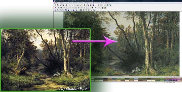 Перегон схем формата PDF в XSDна примере Golden Kite 1533"Wood Landscape with Herons"(600х418 символов, 157 цветов)